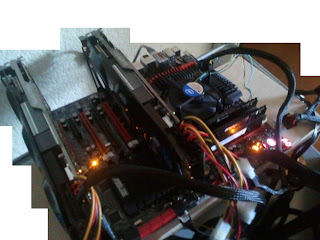 770 kH/s ohne jegliche Optimierung sind mehr als ich erwartet hätte, auch sollten die 650 Watt aus dem Netzteil für 2 Grafikkarten und alles andere viel zu wenig sein. Das Motherboard scheint Wunder zu vollbringen, anders kann ich es mir bisher nicht erklären. Mal sehen wie es mit dem endgültigen Setup läuft und am endgültigen Standort.